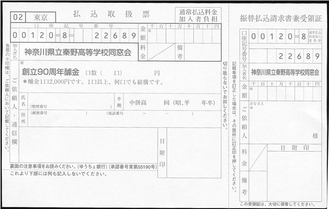 90周年実行委員会事務局℡0463-77-1423(秦野高校内)まで、同窓会では各支部へ、